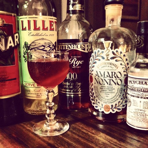 Add the bitters, simple syrup, rye, Lillet and Amaro Nonino to a mixing glass. Add ice and stir. Rinse a chilled cocktail glass with Cynar and strain the cocktail into the glass. Express the oils from the grapefruit twist and discard.