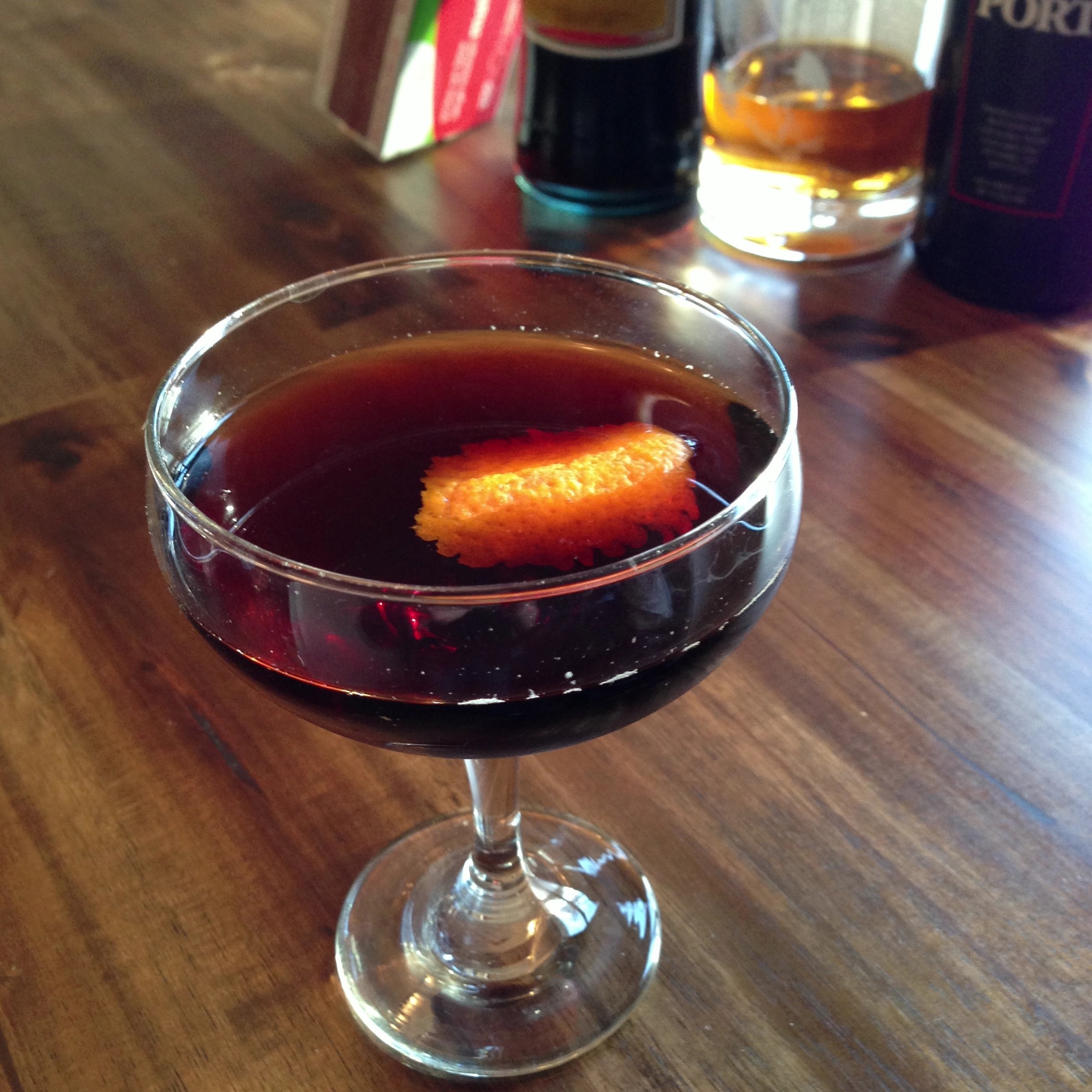 Chill a cocktail glass. Add the Averna, bourbon and bitters to a chilled mixing glass. Dump the ice from the cocktail glass into the mixing glass, then rim the cocktail glass with port. Pour the remaining port into the mixing glass. Add more ice and stir. Strain into the port rinse glass. Garnish with a flamed orange twist.